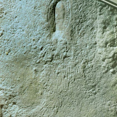 Kimberella quadrata, un organismo ediacarano que producía marcas de alimentación en los tapetes microbianos. Antes del descubrimiento de su fósil corpóreo al lado de las marcas, se pensaba que dichas marchas habían sido hechas por agentes abióticos o por gusanos desconocidos. Fotografía de Fedonkin (2009) The origin of the Metazoa in the light of the Proterozic fossil record.